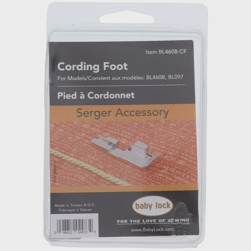 View full detailsBaby Lock Cording Foot – BL460B-CF The Baby Lock Cording Foot (BL460B-CF) makes it easy to serge decorative cording or piping while finishing your...