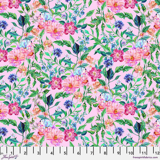 Windflower Tapestry on Blush fabric – PWSB004.BLUSH A vibrant, mural-inspired floral tapestry with lush greenery and colorful blossoms on a blush ...