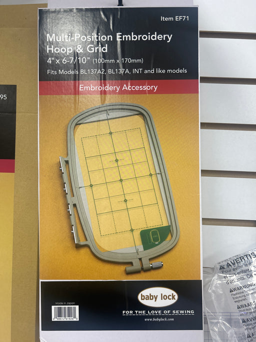 View full detailsBaby Lock EF71 Multi-Position Embroidery Hoop – 4" x 6-7/10" Expand your embroidery possibilities with the Baby Lock EF71 Multi-Position Embroider...