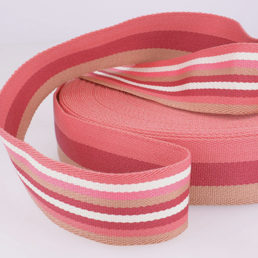 View full detailsDouble Sided Striped Webbing 40mm Pinks #S1104F40-78 40mm (1.57 inch), Double sided striped strapping. 100% Polyester. 22 yds. per roll. Beautiful...