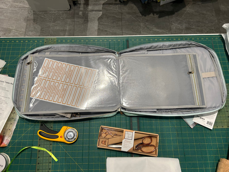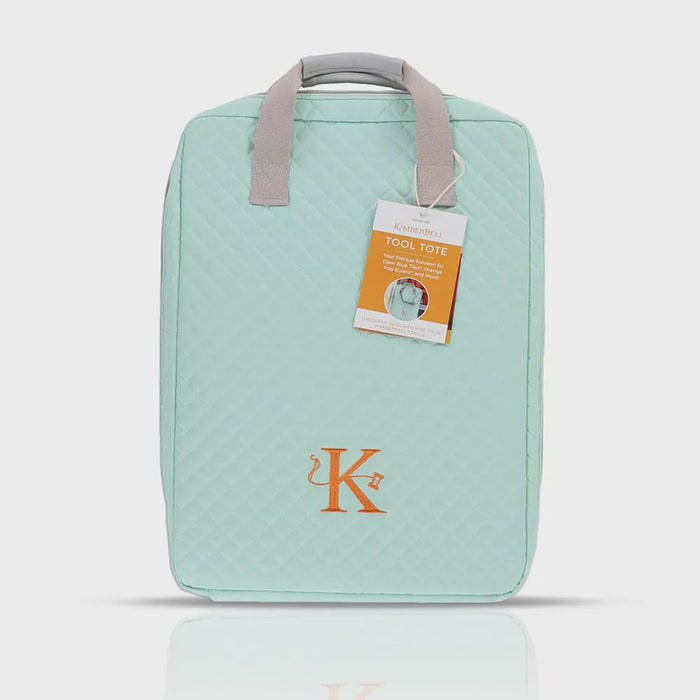 Store and organize all your favorite Kimberbell tools with the Kimberbell Tool Tote! This chic designer bag features 26 elastic slots for USB drives, expandable pockets for Orange Pop Rulers, and clear vinyl pockets perfectly sized for Clear Blue Tiles. Organize your tiles by height, zip the pockets with a stylish gold zipper, and enjoy secure, on-the-go storage. With a quilted exterior, sturdy handles, and a comfortable shoulder strap pad, this tote makes travel and organization easy and elegant.