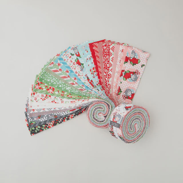 A jelly roll of retro holiday prints with a cat theme. Meow-y Christmas! With all the vintage holiday charm, the Kitty Christmas collection from Urban Chiks for Moda is filled with jovial felines, holly berries, stockings, flowers, and bells. Load up on these cute prints and sew some holiday decor and gifts!