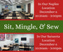 Looking for a space to stitch, socialize, and share your passion? Look no further than our FREE Sit & Sew events! BE SURE TO CHOOSE THE LOCATION YOU ARE ATTENDING